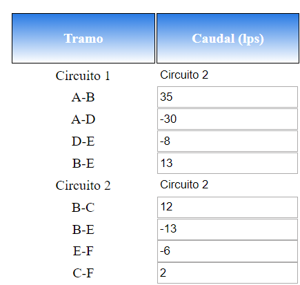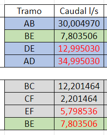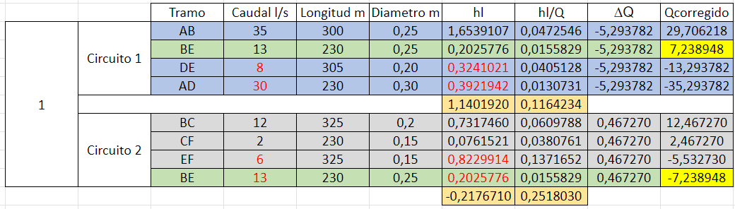 El proceso anteriormente mensionado se sigue para todos los puntos y tramos, y se trata de que en el punto intermedio el caudal sea igual en ambos circuitos.