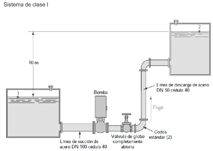 Calcule la potencia suministrada a la bomba que se muestra en la figura 1 si su eficienia es del 76%. Por el sistema fluye un caudal de 0.015 m3 /seg de alcohol metílico a 25 °C. La línea de succión de la bomba ha sido construída empleando un tubo de acero de 4 pulgadas de diámetro Sch 40 y tiene 15 metros de largo. La línea de descarga es un tubo de acero de 2 pulgadas de diámetro Sch 40 y tiene un largo de 200 metros.