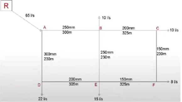 En base al siguiente diagrama, mediante el metodo de Hardy Cross. Calcular la distribución de caudal mas apropiada para el sistema: